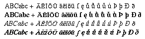 Features: Has additional characters (like "long s"), long vowels (lowercase and uppercase), and floating accents e, a, o, v, i which can be put on any base vowel as a superscript